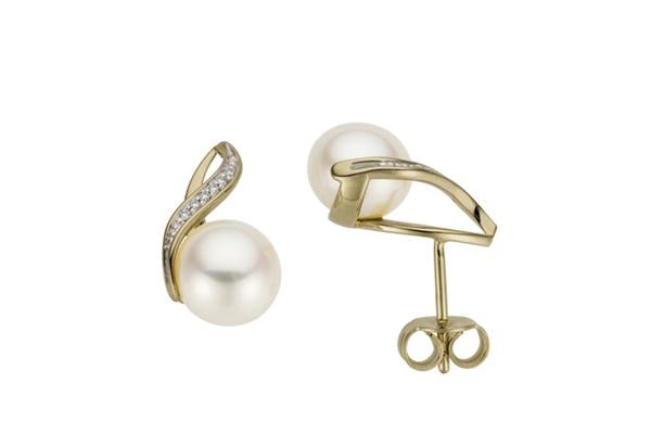 9ct Gold Pearl Stud Earrings, featuring white freshwater bouton pearls and accent diamonds (0.04 ct round brilliant).