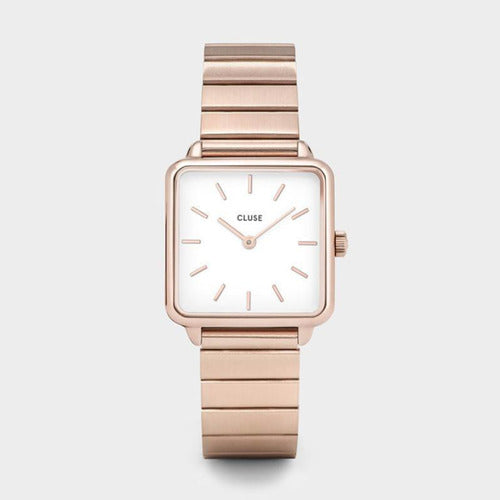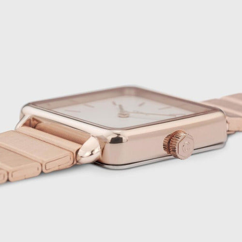 The watch features an ultra thin square shape 7 mm case and a rose gold stainless steel link strap.