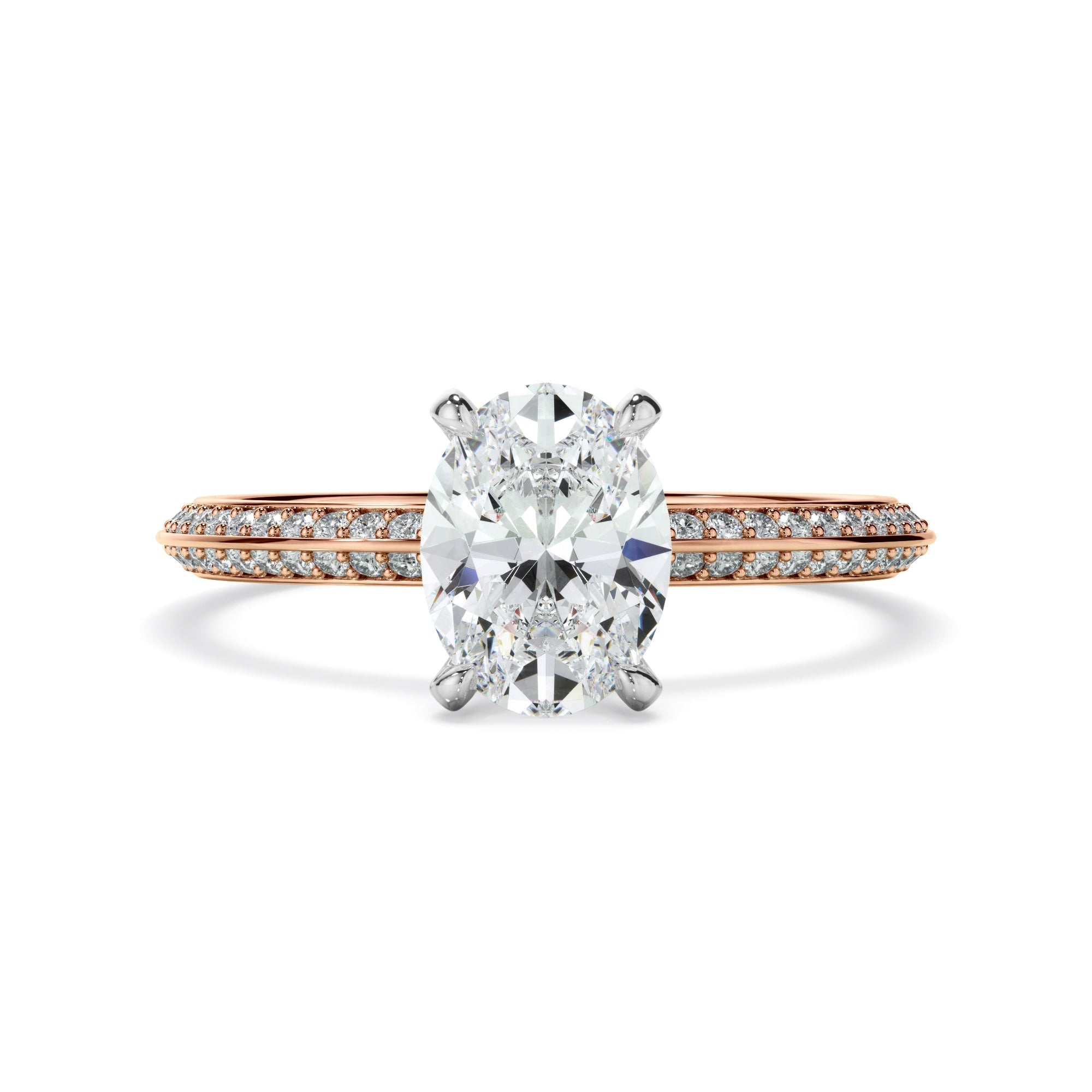 Custom made signature oval cut diamond engagement ring with pave diamond knife edge band, available in platinum, 9ct or 18ct yellow, white or rose gold. Image shown with 1ct diamond centre however can be made in any centre stone size and quality desired. Contact us today, and enjoy a complimentary, personalised appointment with our diamond experts, to design your dream ring within your budget. Virtual, after-hours and off-site appointments are also available for your convenience or simply contact us for further details and information about this style.