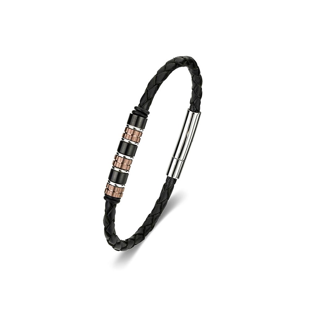 Rose gold and grey stainless steel and black leather bracelet with magnetic stainless steel clasp